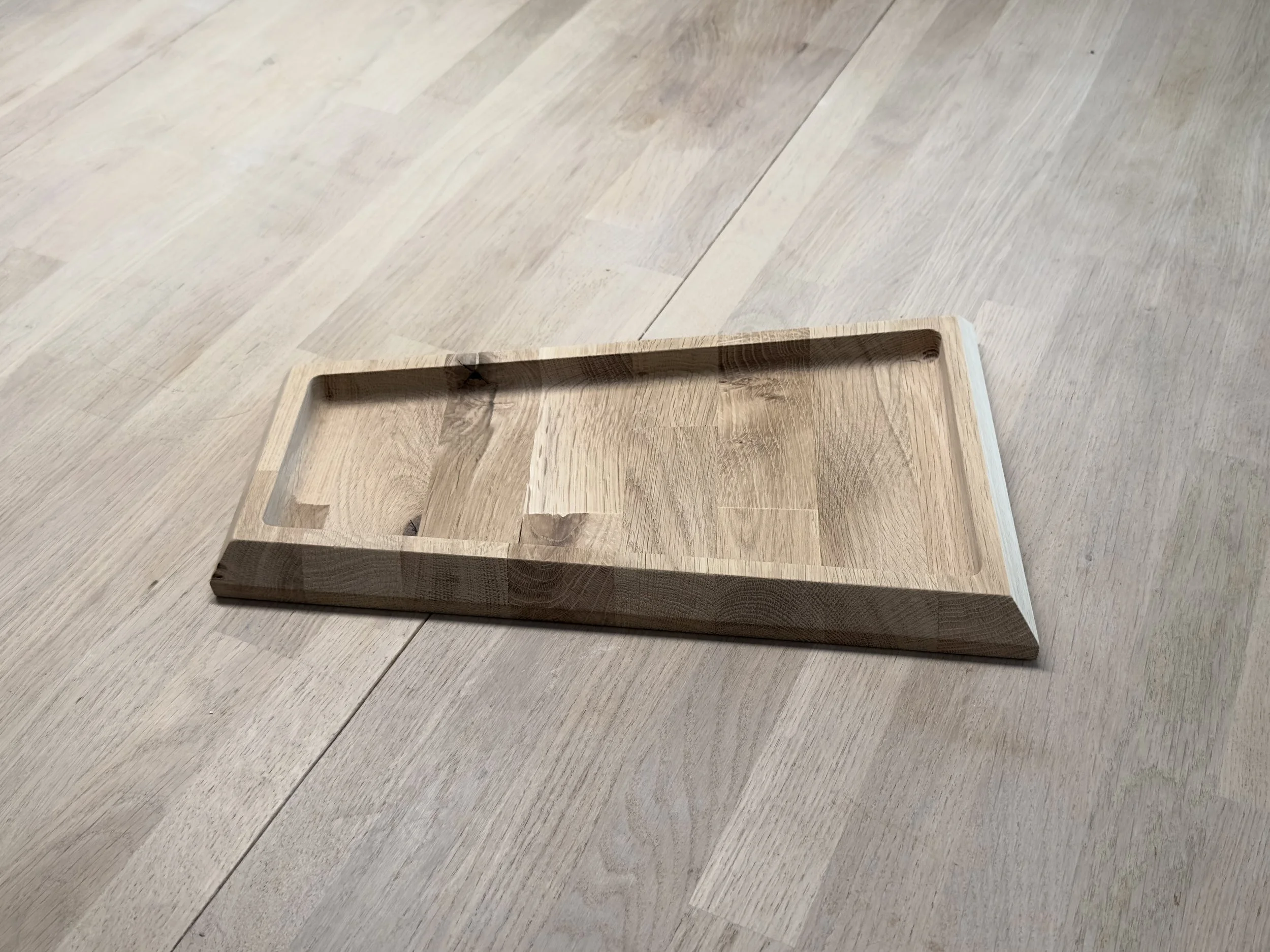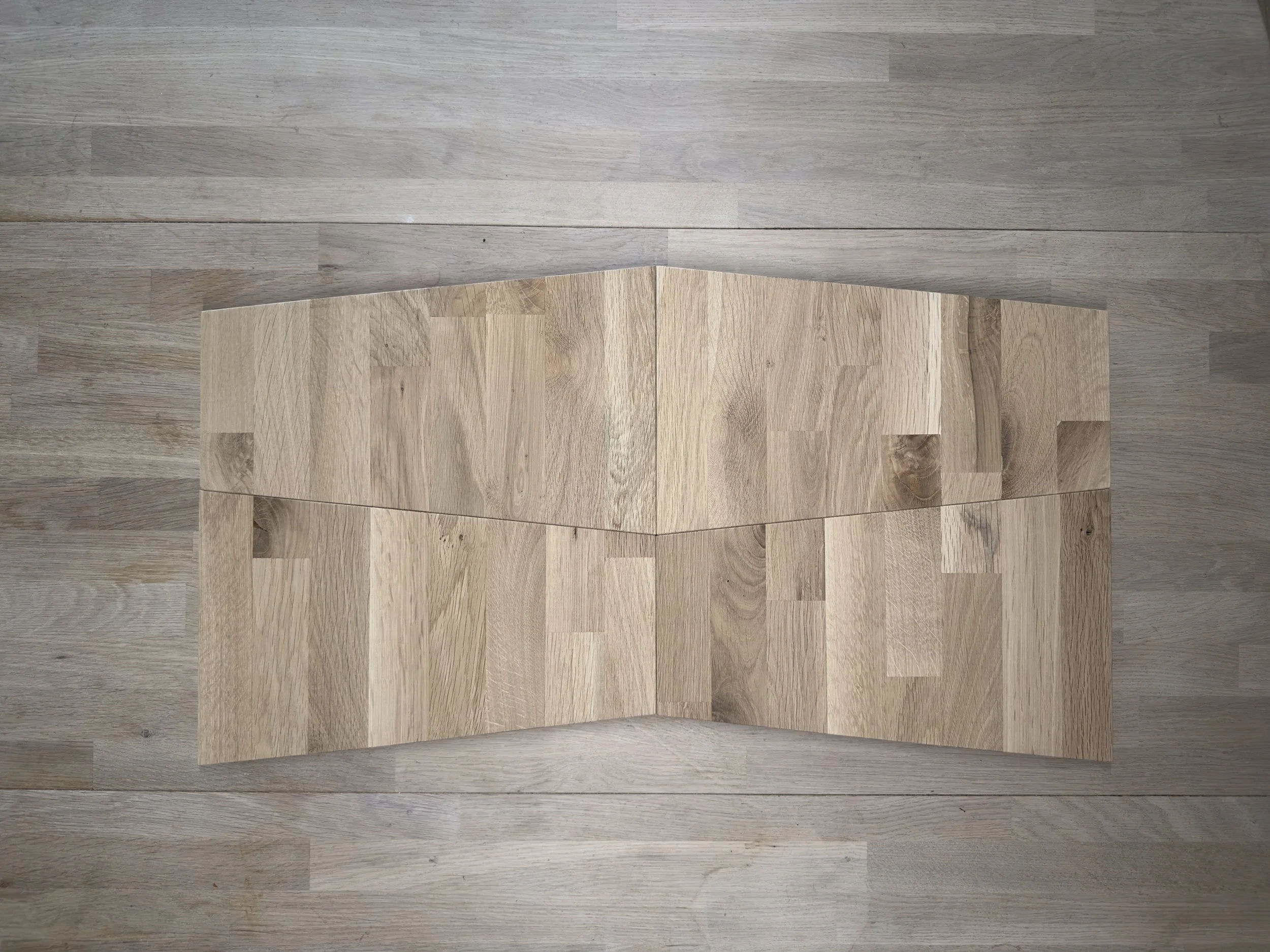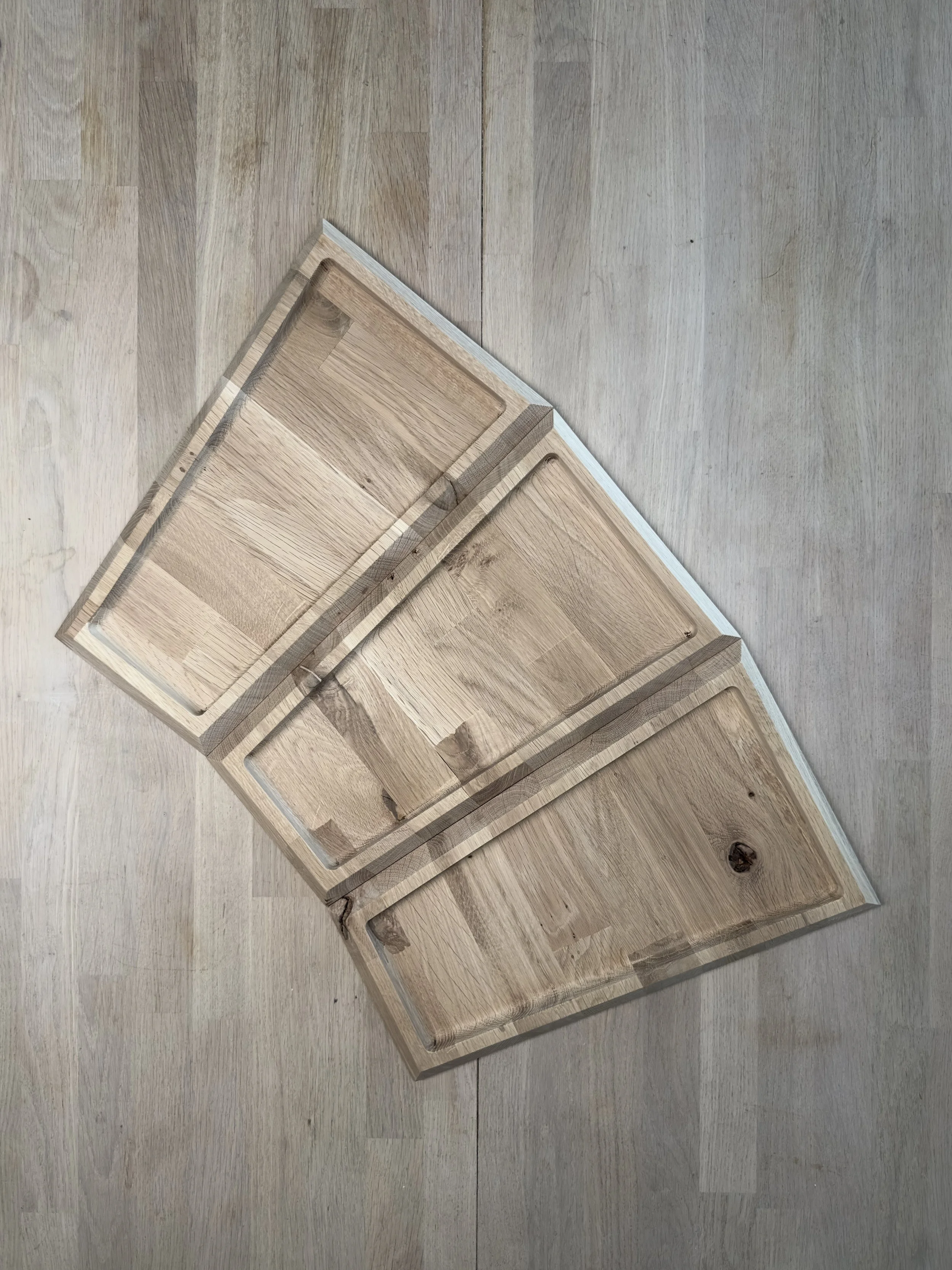 Tarjoilukiilat on modulaarinen tarjoiluastia, jonka suunnittelin aiemmasta ylijäämä-liimapuupalasta. Astia on molemmin puolin käytettävä niin, että sen käyttötarkoitus muuttuu. Se on sekä tarjotin että kulho. Sen kiilamainen muoto mahdollistaa erilaisten asetelmien toteuttamisen.